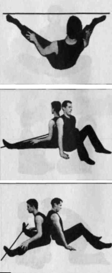 Исходное положение: Первый сидит лицом к стене, максимально разведя ноги в стороны и уперев стопы в стену.