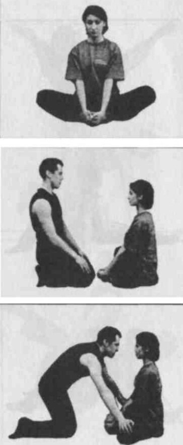 Исходное положение: Первый сидит на полу, ноги в положении «бабочки», и держит руками свои стопы. Второй стоит на коленях лицом к Первому.