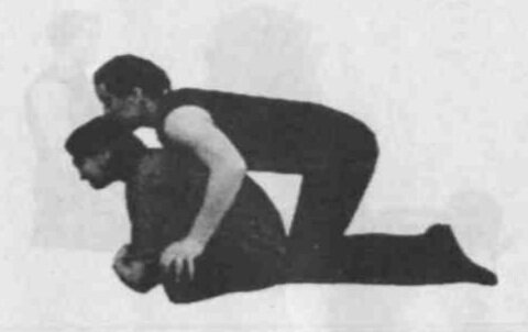 Упражнение. Второй прижимает руками колени Первого к полу и давит грудью на корпус партнера, укладывая его на пол.