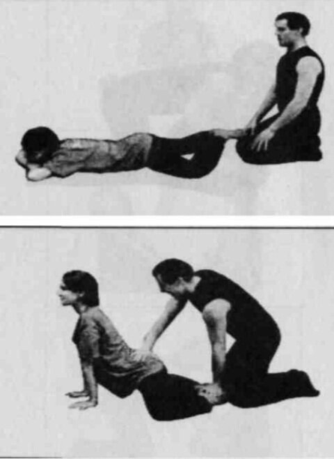 Упражнение. Упираясь ногами в пол, Второй спиной пытается прижать бедра партнера к стене.