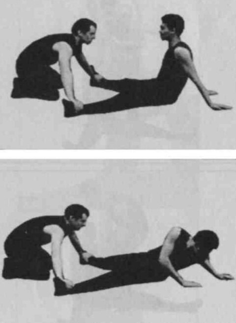 Упражнение. Первый, слегка согнув ноги в коленях, поднимает их за счет прогиба в спине. Второй беретщиколотки Первого и тянет ноги партнера вверх, на себя, увеличивая прогиб.