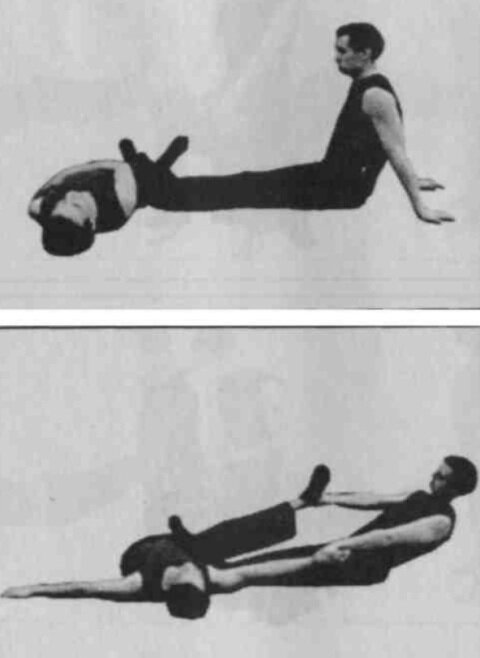 Исходное положение: Первый лежит на спине. Второй садится слева под прямым углом к Первому, упираясь ему стопами в бедро.